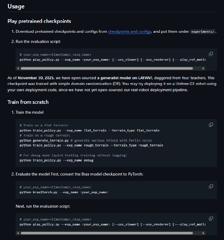 Π½ΠΎΡΡΠΈ ΠΈ Π·Π°ΠΏΡΡΠΊΠ° ΠΌΠΎΠ΄Π΅Π»Π΅ΠΉ. π΅ΠΠΎΠ½Π²Π΅ΡΡΠ°ΡΠΈΡ ΠΌΠΎΠ΄Π΅Π»Π΅ΠΉ Brax/JAX Π² PyTorch. π΅ΠΠΎΠ΄Π΄Π΅ΡΠΆΠΊΠ° Π΄Π°ΡΠ°ΡΠ΅ΡΠΎΠ² mocap, Π²ΠΊΠ»ΡΡΠ°Ρ LAFAN1 ΠΈ UnitreeG1. π΅ΠΠ°Π»ΠΈΡΠΈΠ΅ generalist-ΠΌΠΎΠ΄Π΅Π»ΠΈ, ΡΠΏΠΎΡΠΎΠ±Π½ΠΎΠΉ Π²ΡΠΏΠΎΠ»Π½ΡΡΡ ΠΌΠ½ΠΎΠΆΠ΅ΡΡΠ²ΠΎ ΡΠΈΠΏΠΎΠ² Π΄Π²ΠΈΠΆΠ΅Π½ΠΈΠΉ. π± Π Π΅ΠΏΠΎΠ·ΠΈΡΠΎΡΠΈΠΉ β‘οΈΠ‘ΠΏΡΠ°Π²ΠΎΡΠ½ΠΈΠΊ ΠΡΠΎΠ³ΡΠ°ΠΌΠΌΠΈΡΡΠ°. ΠΠΎΠ΄ΠΏΠΈΡΠ°ΡΡΡΡ