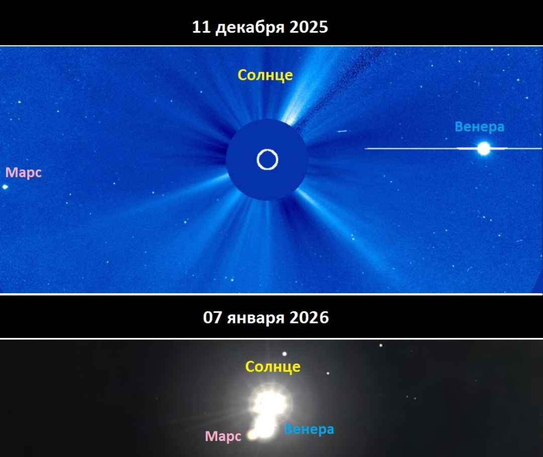 Обе ближайшие к Земле планеты, Венера и Марс, которые в настоящий момент движутся к предстоящему в первых числах будущего года исключительно редкому соединению с Солнцем, с сегодняшнего дня стали видны на снимках, поступающих с космических коронографов LASCO и находящихся в открытом доступе. Венера появилась на изображениях ещё неделю назад, 3-4 декабря, как исключительно яркая звезда, пересвечивающая и даже частично заливающая изображения, которая вышла справа от Солнца. Сегодня ночью в поле зрения с другой стороны вошла и вторая планета, Марс, заодно подтвердив самим фактом своего появления неумолимые законы небесной механики, которые, собственно, и толкают в настоящий момент тела навстречу друг другу. Уже меньше чем через месяц, с 6 по 8 января, в период православного Рождества, два небесных тела соединятся с Солнцем на небе на минимальное расстояние, которое в наибольшем сближении составит менее одного градуса — исключительно редкое событие, которое следующий раз придется ждать
