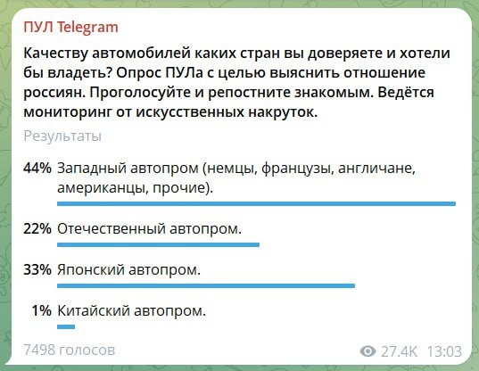 В комментариях к постам, которые так или иначе касаются темы отечественного автопрома, мы то и дело читаем, что он сильно отстал даже от китайского. Смеем предполагать, что наши подписчики разбираются в предмете и не понаслышке могут сравнивать машины из РФ и КНР. Но вот опрос неавтомобильного канала-агрегатора с аудиторией в 50 тысяч человек. И что мы видим? Ну с западными и прочими иномарками все понятно - не стоит даже обсуждать. Но 22% респондентов осознанно выбрали бы российские автомобили и только 1% - китайские. Допускаем, что часть голосовавших, не сильно вникая, сделала клик в пользу самого патриотичного варианта. Но разница в более чем 1000 проголосовавших дает основание предположить, что многие "обычные" россияне до сих пор остаются на стадии "отрицания" в отношении "китайцев". Честно, мы удивлены. #инфографикадня 🇨🇳🇷🇺 Наш сайт | Канал "Только новости" | Канал "Только видео" | Казахстан