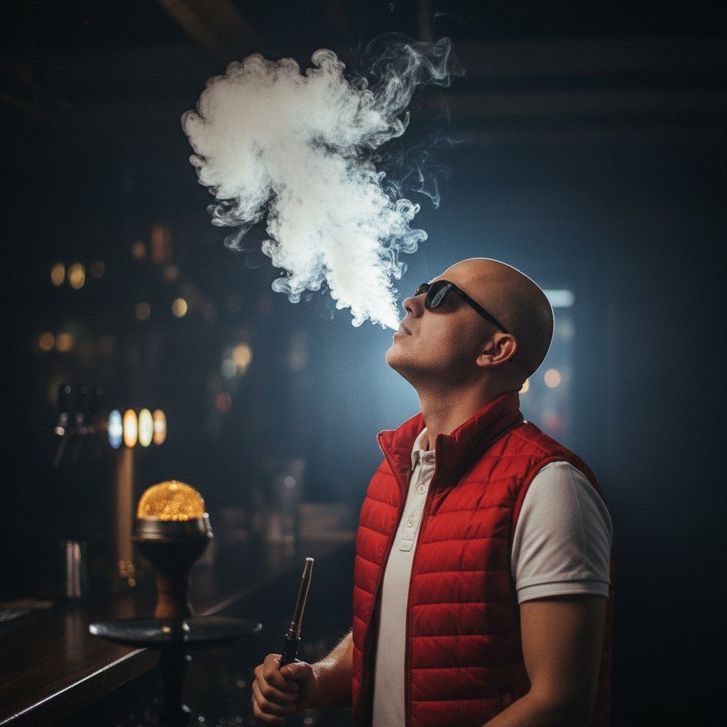 Создай портрет, не меняя черты лица. Реалистичная фотография молодого мужчины в полу профиль, находящегося в темном баре. Он выдыхает огромное, густое облако белого дыма вверх. Мужчина одет в белую рубашку поло, на нем красная дутая желетка. Он держит в руке трубку кальяна. На переднем плане виден сам кальян с чашей, закрытой золотистой защитной сеткой. На заднем плане в расфокусе (боке) видны пивные краны и элементы барной стойки. Освещение драматичное, контровой свет ярко подсвечивает текстуру дыма, создавая контраст с темным фоном. Высокое разрешение, кинематографичный стиль.размытый фон, боке. Драматичное освещение, рим-лайт (контровой свет), темная атмосфера, фотореализм, 8k, высокая детализация, четкий фокус на лице и дыме. Промт и боты Nano Banana👇👇👇 https://t.me/nanobanana_promt/23 https://dzen.ru/nanobanana_promt