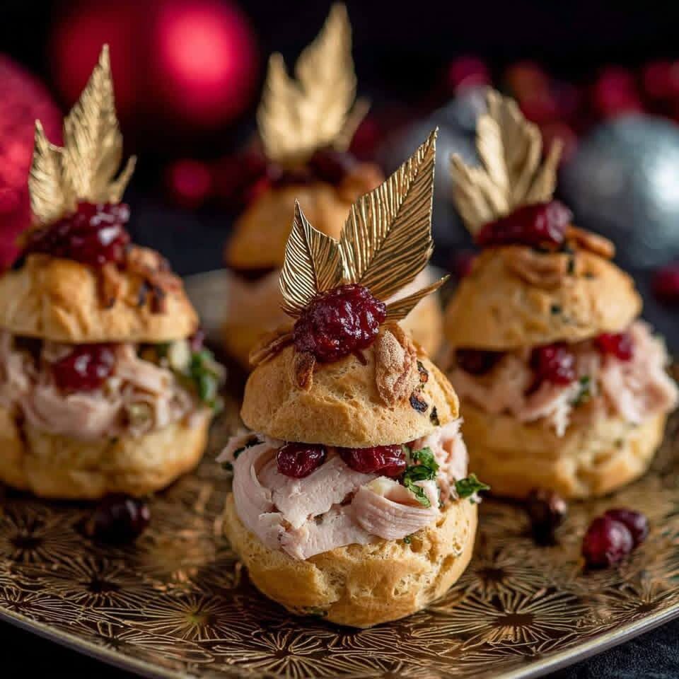 👥 Для: 6 человек ⏱️ Приготовление: 35 минут 🌟 Ингредиенты Для булочек и начинки 🧈 50 г сливочного масла 💧 75 мл воды 🧂 1 щепотка соли 🌾 60 г муки 🥚 2 яйца 🍗 250 г вареной индейки 🍃 40 г измельченной зелени петрушки(или другой свежей травы) 🍒 120 г жареной или засахаренной клюквы 🍯 60 г клюквенного соуса 🍂 Съедобные украшения 🍽️ Пошаговое приготовление 1. Приготовьте заварное тесто 🫕 Нагрейте в кастрюле воду, масло и соль до кипения. 🌾 Добавьте муку одним махом, затем энергично перемешайте, пока тесто не оторвется от стенок. 2. добавьте яйца 🔄 Сняв с огня, добавляйте яйца по одному, хорошо перемешивая, чтобы получилось гладкое и податливое тесто. 3. сформируйте шарики 🥄 Выложите небольшие шарики теста на противень, затем выпекайте 20 мин при температуре 180°C, пока они не подрумянятся и не станут светло-коричневыми. Дайте остыть. 4.🔪 Приготовьте начинку 🍗 Индейку мелко нарежьте. 🍃 Смешайте ее с измельченной зеленью петрушки в блендере. 5. Соберите булочки 🔪 Разреж