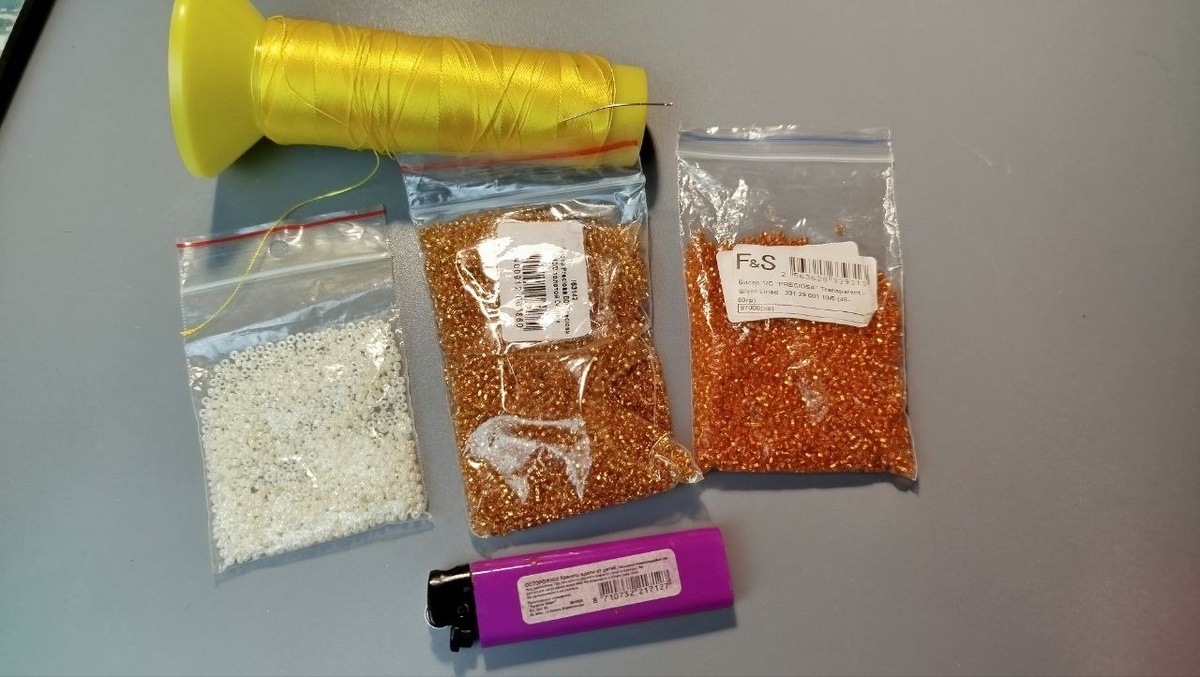 Итак, для работы я беру чешский бисер трех цветов, синтетическую нить, тонкую иголку, зажигалку и пару бусин.
