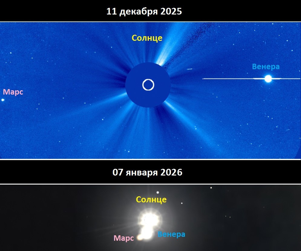 Сближение Марса и Венеры с Солнцем с сегодняшнего дня можно наблюдать на снимках с космических телескопов, сообщает Лаборатория солнечной астрономии ИКИ РАН Уже меньше чем через месяц, с 6 по 8 января, в период православного Рождества, два небесных тела соединятся с Солнцем на небе на минимальное расстояние, которое в наибольшем сближении составит менее одного градуса — исключительно редкое событие, которое следующий раз придется ждать более 200 лет — до лета 2267 года. Увидеть эту своеобразную Вифлеемскую звезду непосредственно в рождественскую ночь не удастся, потому что соединение формируется на дневном небе, и ночью будет скрыто за горизонтом. 🔴 Читайте Sputnik Беларусь в MAX