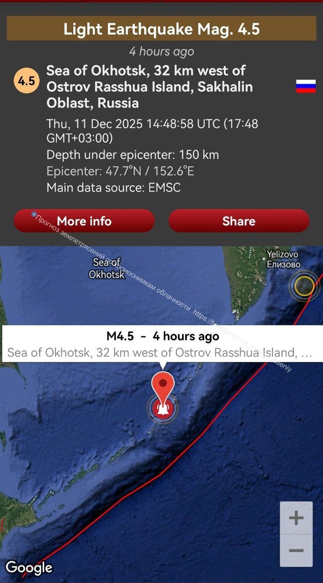 В ответ на пост По Курилам, в месте где сошлись 2 ОСы вчера, сегодня произошло глубокое землетрясение М4. Это может быть признаком форшоковой активности перед более сильным ЗМТ.