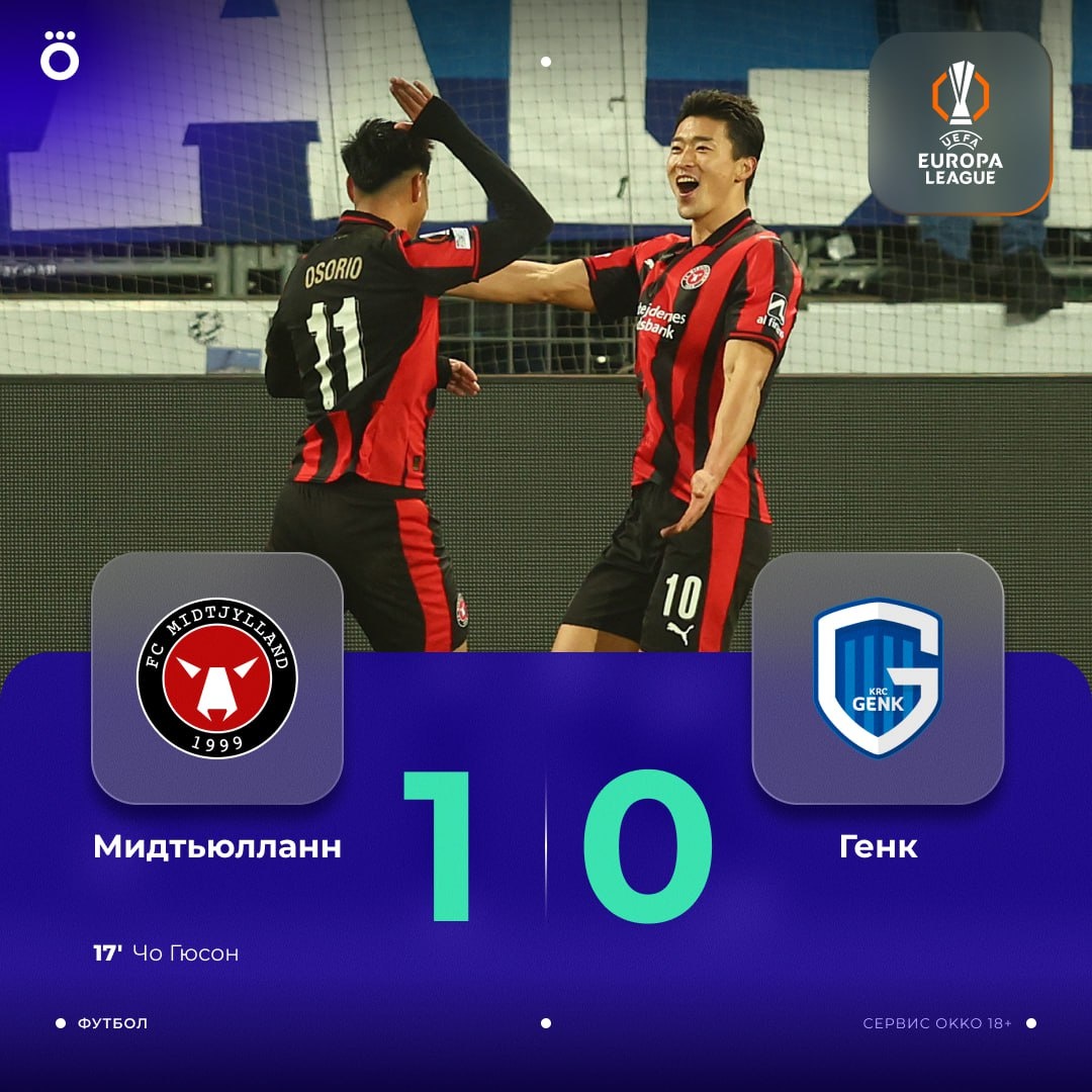 «Мидтьюлланн» возглавил таблицу общего этапа Лиги Европы — для победы над «Генком» хватило одного гола 🔥 Тоже немного в шоке от успеха датчан?