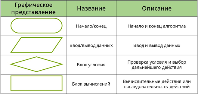 Алгоритм изображается с помощью блок-схемы — последовательности геометрических фигур, в которых записываются команды. Элементы блок-схемы между собой соединяются линиями и стрелками, которые показывают ход выполнения алгоритма.
