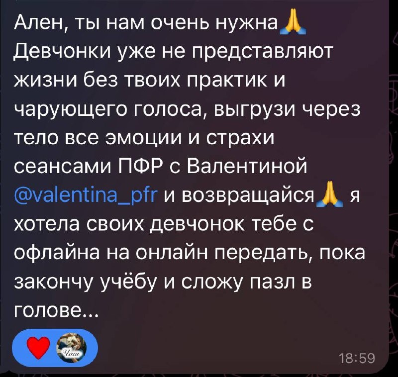 Ира, спасибо большое ❤️❤️❤️ Несколько лет я делала практики онлайн 🧘♀️ (лет 5, наверное). Всем, кто был со мной: «Привет ❤️» Много часов ныряла в телефон для постов, диагностик, онлайн консультирования, монтажа, сторис, ответов на сообщения, коллабораций, акций, предложений, съёмки практик, техник, отдельных уроков…. Мне этого уже достаточно. Я сама делаю практики КАЖДЫЙ ДЕНЬ ❤️❤️❤️ и мне ОЧЕНЬ комфортно делать их для себя, без камеры, без красивой картинки, света…. и даже без одежды. Стоя босиком на траве, в лесу, в поле… Телесные практики 🧘♀️ это часть моей жизни. Это мой ключик ЗДОРОВЬЯ ❤️, как и звучание, банное парение, купание в холодной воде, ходьба босиком по снегу… Я всё меньше онлайн и всё больше офлайн ❤️❤️❤️ Возможно будут «программы оздоровления», записанные уроки оздоровления, но… вести практики «на камеру» у меня больше нет… как это сказать: «не стоит». Более того: Практикую дни БЕЗ телефона, ограничиваю время в телефоне, НЕ проверять сообщения каждые 3 секунд