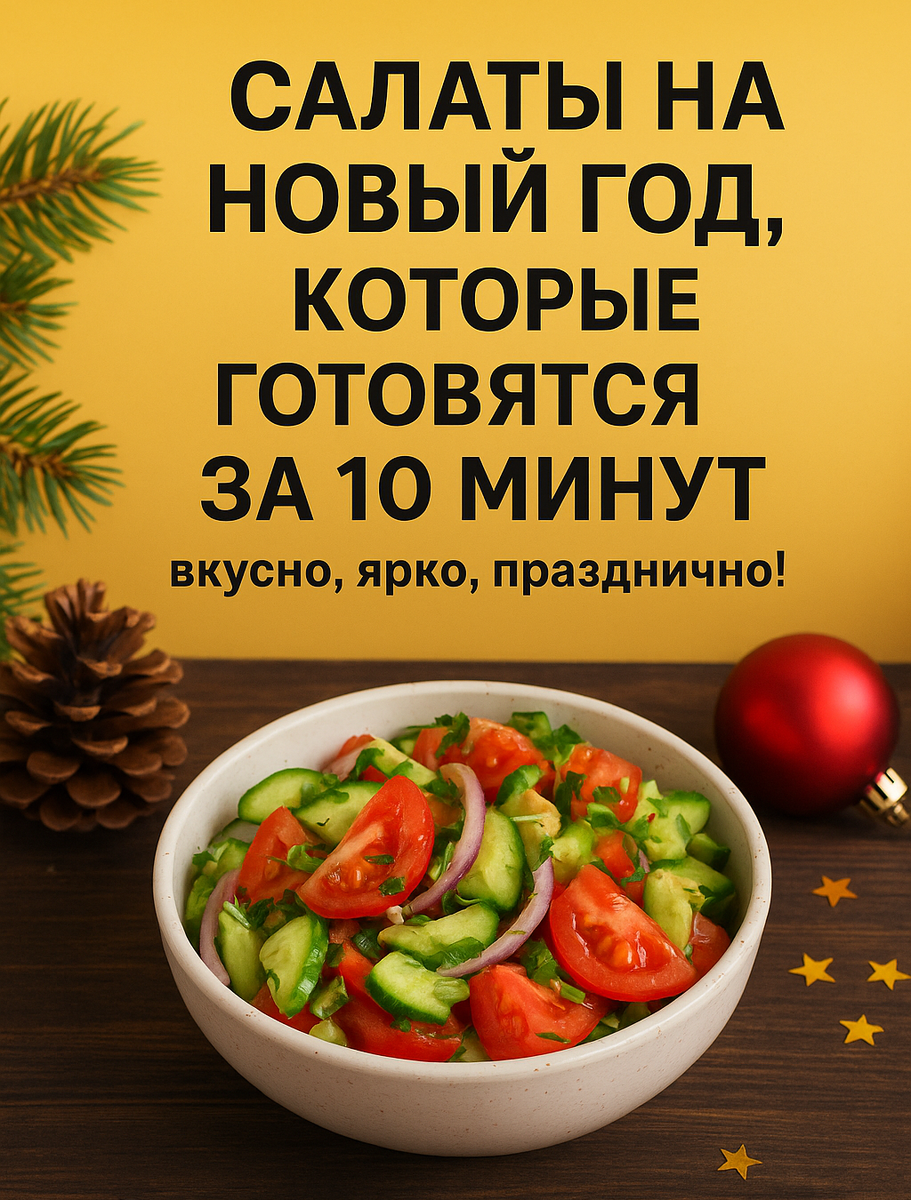 Новогодний стол — это не только «Оливье» и шуба, которые требуют времени, терпения и стратегического планирования. Иногда хочется чего-то свежего, яркого и не менее праздничного, но без многочасового рубилова на кухне. Особенно когда гости вот-вот придут, а ты ещё доедаешь последние мандарины и просто мечтаешь успеть всё вовремя. Поэтому сегодня делюсь подборкой салатов, которые готовятся быстрее, чем ты успеешь включить «Иронию судьбы». Минимум усилий — максимум красоты и вкуса. 🥗 1. Салат «Зимняя свежесть» (огурцы + сыр + чесночок) Время: 7 минут Ингредиенты: огурцы — 2–3 штуки твёрдый сыр — 100 г сметана или йогурт — 2 ст. л. чеснок — 1 зубчик укроп, соль, перец Как готовим: