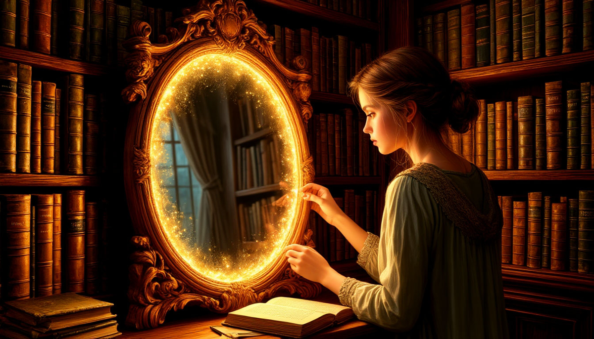 Там царил полумрак, пронизанный лучами солнца, пробивавшимися сквозь пыльные стёкла. Полки до потолка, забитые книгами. И в самом дальнем углу, между шкафами с энциклопедиями и собраниями сочинений, стояло Оно. Большое, в массивной резной деревянной раме, зеркало. Его поверхность была не прозрачной, а матовой, тусклой, словно затянутой пеплом. Я всегда его побаивалась в детстве — оно казалось живым, всевидящим.