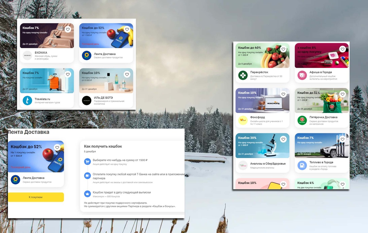 Реально большие кэшбэки в конце 2025 года, которые не сразу можно найти Как я уже говорил, большие кэшбэки сейчас не там, где категории, а там, где предложения партнеров. Если раньше большой кэшбэк можно было получить только на что-то ненужное по изначально завышенной цене, то сейчас дают на то, что нам нужно каждый день – на еду. И да, действительно, можно получать кэшбэки по 40-50% на еду на условно-постоянной основе. Но это действует на продукты, заказанные доставкой (имеется ввиду не доставка Город от Т-Банка, а доставка магазина). Что касается Т-Банка, то нужно почаще заглядывать в раздел «Предложения партнеров», особенно в «ежедневный кэшбэк» . Ежедневный кэшбэк – это предложения партнеров, которыми можно воспользоваться в течении суток, поэтому заглядывать надо перед сном, если ложитесь после полуночи, либо с утра. Обидно бывает узнать в 23 часа, что мог получить 55% кэшбэка в любимом магазине, но не знал об этом. Другие предложения могут висеть неделю или даже больше. А вот б