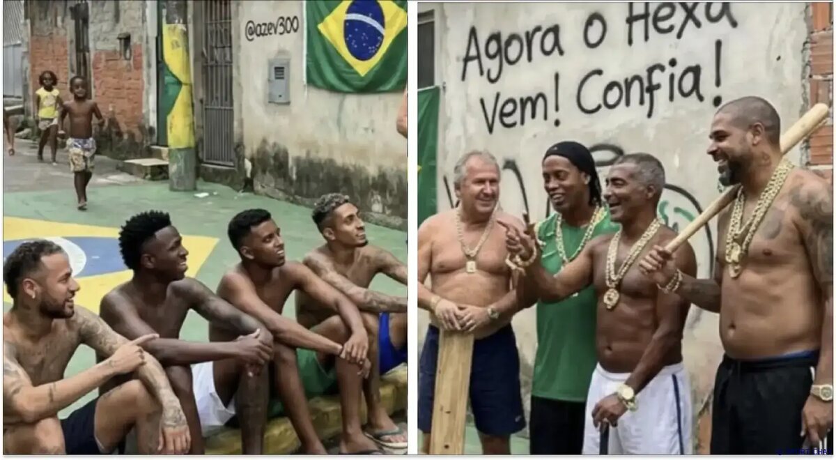На сгенерированном ИИ изображении легенда бразильского футбола стоит в фавеле Рио рядом с Роналдиньо, Зико и Адриано; каждый держит бейсбольную биту, будто запугивая нынешних звёзд сборной.