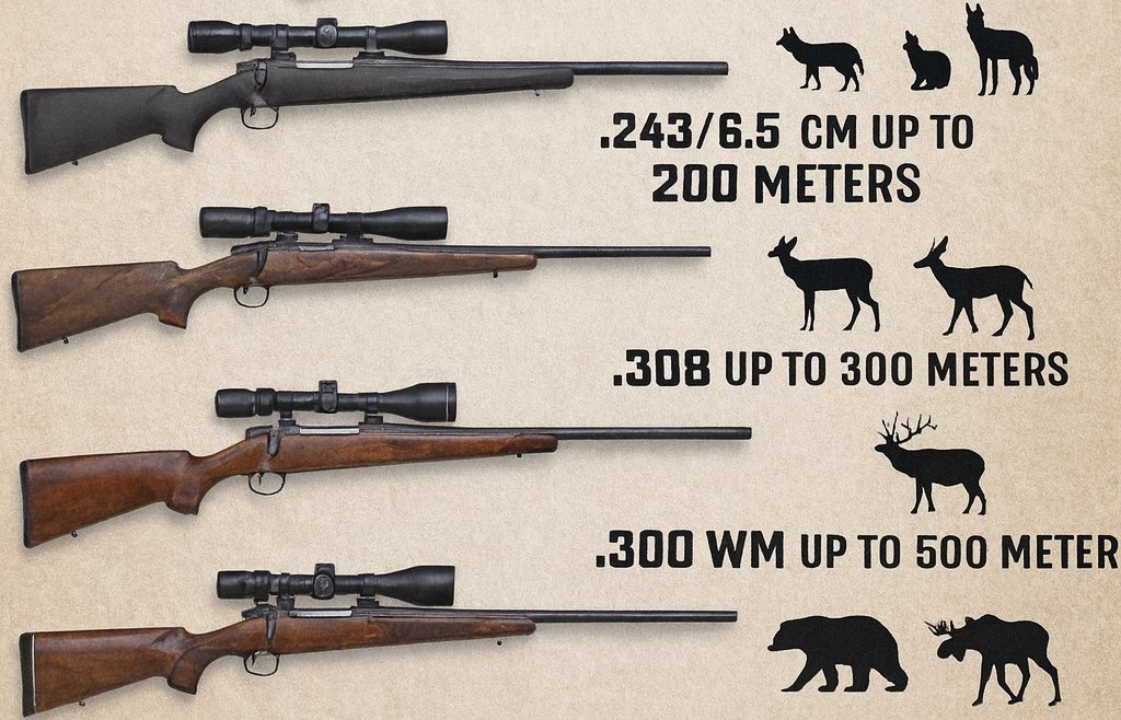 Ниже — иллюстративные сочетания «зверь–дистанция–калибр–тип карабина»: