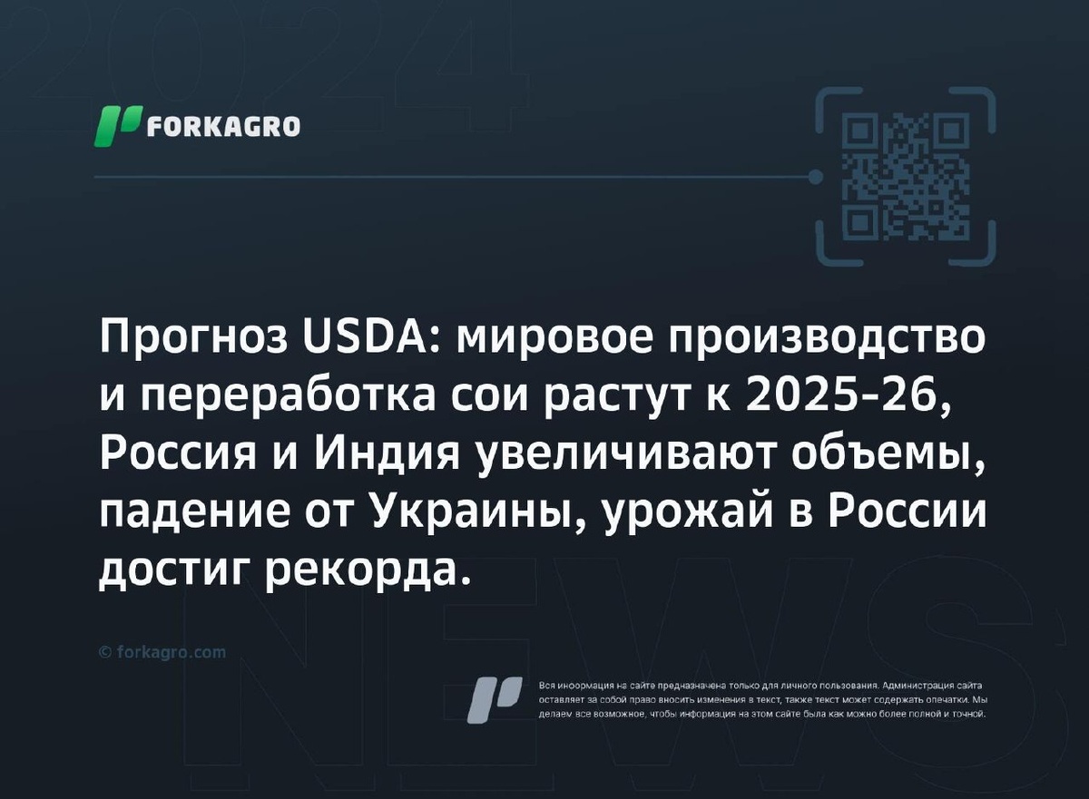 Прогноз USDA: мировое производство и переработка сои растут к 2025-26, Россия и Индия увеличивают объемы, падение от Украины, урожай в России достиг рекорда. Министерство сельского хозяйства США повысило прогноз мирового выпуска сои на сезон 2025/26: увеличится производство и переработка, в то время как экспорт уменьшится. Россия и Индия увеличат поставки, в то время как Украина и Канада снизят. Рекордный урожай сои в России в 2025 году приведет к снижению импорта. Использование соевого масла в производстве биотоплива также изменится. Перейти к источнику