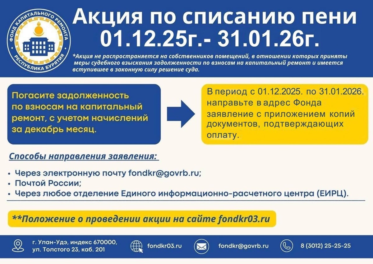 Фонд капитального ремонта Республики Бурятия объявил акцию по списанию пени за задолженность по взносам на капитальный ремонт. Акция проводится с 1 декабря 2025 года по 31 января 2026 года. Чтобы списать пени, достаточно закрыть основную задолженность (включая декабрь) и направить в Фонд заявление с подтверждением оплаты. Подать заявление можно: — по электронной почте fondkr@govrb.ru — через «Почту России»; — в любом отделении ЕИРЦ. Подробная информация — на сайте fondkr03.ru. 📲 Администрация Селенгинского района в МАХ