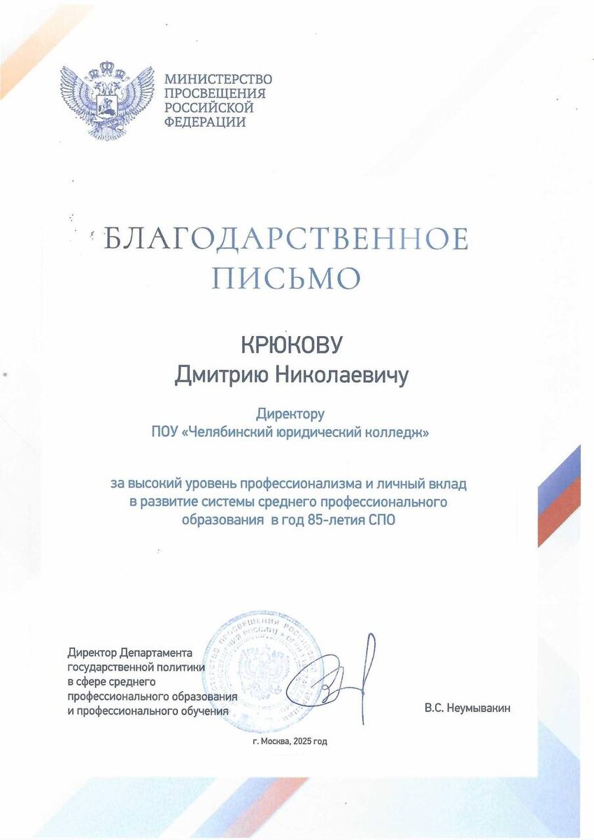 Дмитрий Николаевич Крюков, Директор нашего колледжа, награжден Благодарственным письмом Министерства просвещения РФ за высокий уровень профессионализма и личный вклад в развитие системы СПО!