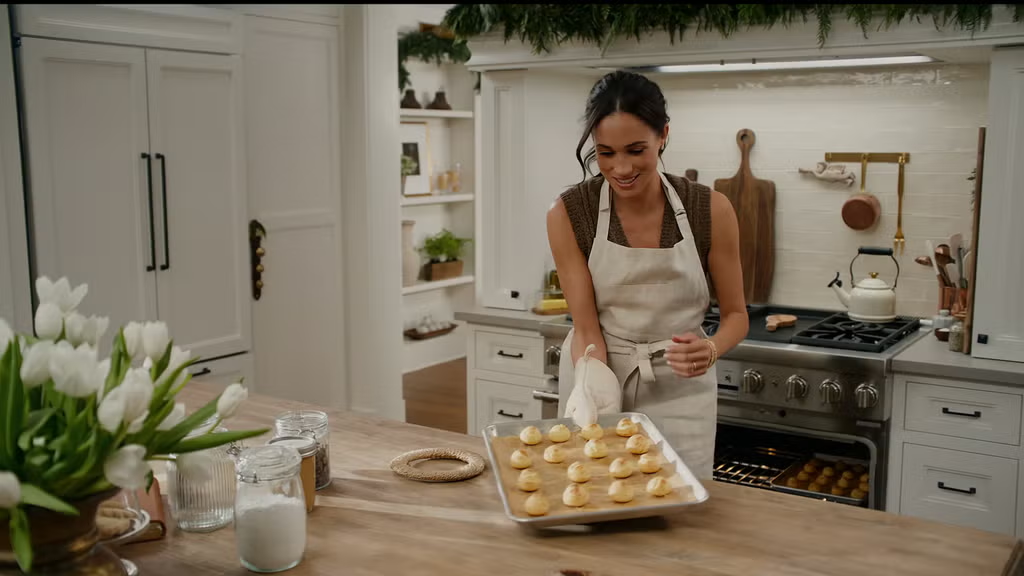 С любовью, Меган: праздничное торжество, идеально приуроченное к сезону распродаж, наполнено скрытыми идеями для подарков. Пока она была занята приготовлением сладостей для гостей, мы заметили, что льняной фартук Solino, который Меган неоднократно надевала на протяжении всего сериала, станет отличным подарком для домашних пекарей. Чайник Le Creuset, который она держит на плите, тоже станет прекрасным подарком, как и набор стеклянных мисок или контейнер для соли из мрамора, похожий на её собственный.