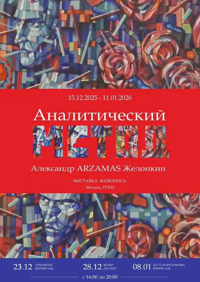 15 декабря – 11 января в Малом зале Российской государственной библиотеки для молодёжи (РГБМ) пройдёт выставка «Аналитический метод» — диалог об искусстве и жизни между нашим современником, художником Александром Арзамасом Желонкиным, и основоположником аналитического искусства Павлом Филоновым. В последние годы крупнейшие выставочные залы Москвы и Петербурга всё чаще возвращаются к наследию русского авангарда, проводят параллели с современностью. Особое место в этих проектах отводится фигуре Павла Филонова и его уникальному аналитическому методу. Современник Малевича и Кандинского, он прошёл путь от признания до забвения, но до конца верил в свою страну и будущее своего искусства, усердно работая — от частного к общему, вписывая свои «атомы» в космос русской культуры. Русская идея, авангард, современность, война и мировой расцвет, Родина, вера, наследие, наука, взгляд в будущее — эти темы с аналитической точностью раскрыл идеолог «сделанных картин», а сегодня продолжает наш соврем