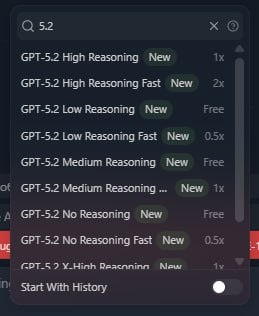 4 новости для вайбкодеров, и все хорошие 🔥 1️⃣ Вышел GPT 5.2 не будем углубляться в бенчи, сравнения, ожидания, мы точно знаем что новая будет лучше старой, что бенчи давно дискредитировали себя, и что подобные модели уже задали стандарт индустрии и все с ними должно быть в порядке. 2️⃣ GPT 5.2 уже появилась в Windsurf и успешно пашет в проектах прямо во время написания новости. 3️⃣ В Windsurf она бесплатная (см. скрин), это ли не счастье? 5.1 с самого выхода тут была бесплатной до момента появления 5.2, так что бегом обновляться. 4️⃣ Работает быстрее чем предыдущая модель, которая в ночь могла прям совсем проседать даже на LOW режиме рассуждения.