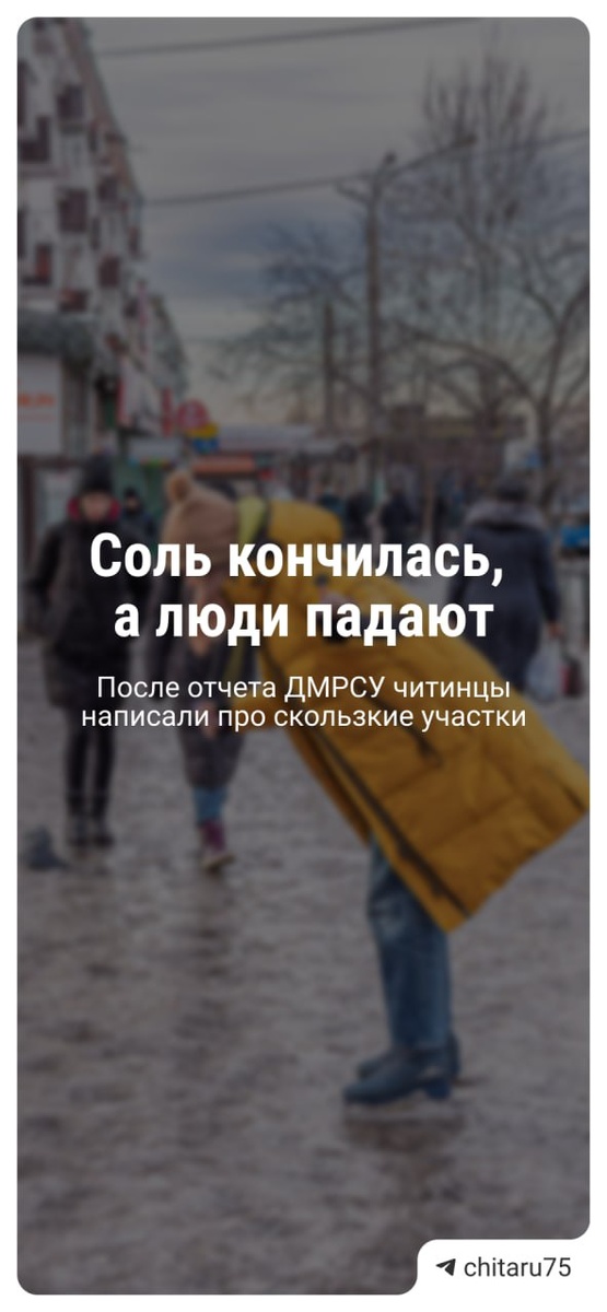 Читатели @chita.ru продолжают жаловаться на скользкие улицы. И. о. директора ДМРСУ Валерий Ларионов во время своего отчета перед депутатами гордумы рассказал, что основные зимние работы перевыполнили. Он отчитался о подметании дорог, посыпке ото льда, очистке проезжей части и остановок от снега и льда. В комментариях под постом снова перечислили проблемные улицы. Претензии прозвучали в адрес 9 Января и Чкалова в районе пересечения с Островского, улицы Угданской около домов 26 и 28, Красноармейской, Бабушкина около домов 98а, 98 и Богомягкова около домов 47 и 49. На перекрестке Новобульварной и Фрунзе одна из читательниц заметила глыбы льда, через которые приходится перепрыгивать пешеходам. 🟦 «Чита.Ру» в MAX | Предложить новость