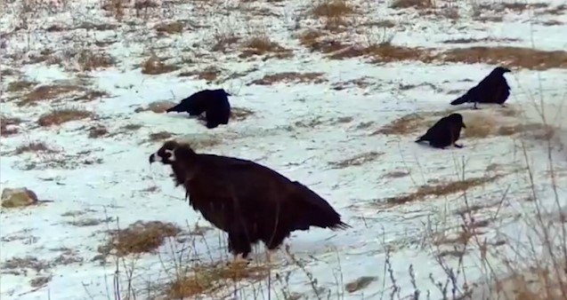 Черного грифа в компании ворон засняла фотоловушка в Забайкалье