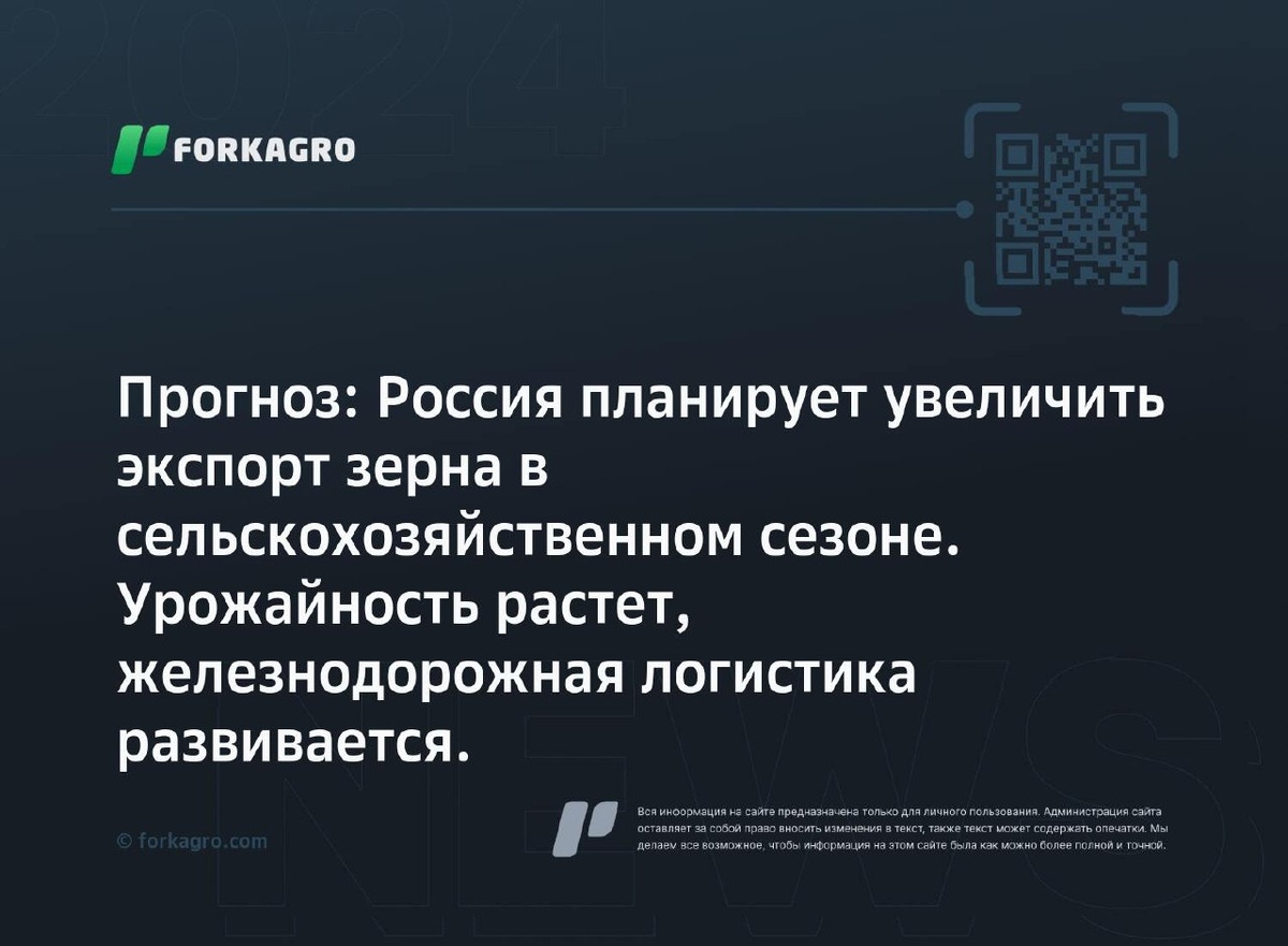 Прогноз: Россия планирует увеличить экспорт зерна в сельскохозяйственном сезоне. Урожайность растет, железнодорожная логистика развивается. Согласно аналитическому центру "Русагротранс", в будущем российский экспорт пшеницы может достигнуть 44 млн тонн, ячменя - 5,3 млн тонн, кукурузы - 3,8 млн тонн. Сбор урожая зерновых в России прогнозируется на уровне 138,4 млн тонн, с высокой урожайностью в Сибири. Логистика железнодорожных перевозок зерна также растет, прогнозируется рост объема до 20 млн тонн в 2025/26 году. Глобально, ожидается прирост урожайности пшеницы в десяти ведущих странах-экспортерах. Перейти к источнику