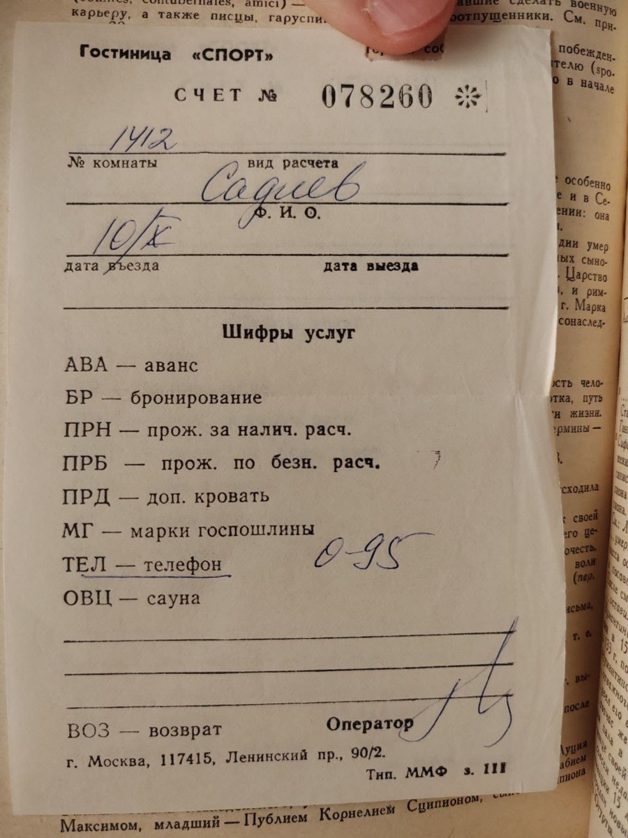 Ночная история Очень часто, когда покупаю книги, нахожу в них оставленные записки, вырванные талоны или незначительные документы. Вот и сегодня/вчера нашёл в книге счёт из гостиницы «Спорт». Мне захотелось узнать побольше... и понеслась. Приготовьтесь к длинному тексту Итак, на счёте нет даты, точнее только число и месяц — 10 октября — года нет. Начал с простого: я купил книгу Гая Саллюстия Криспа издательства «Наука» 1981 года; гостиница «Спорт» существовала до 2004 года. Так-с, большой промежуток. Что ещё? Что за номер «0-95»? После недолго поиска выяснил, что это код Москвы, который использовался до 1 декабря 2005 года, до перехода на международный стандарт. Видимо, товарищ Садиев совершил внутригородской звонок. Код 0-95 использовался с была построена в 1979 году к Олимпиаде, а взорвана (!) в 2004. Как это взорвана? Подумал