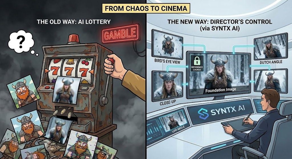 Большинство людей используют генераторы видео как игровой автомат в казино. Дернул ручку, зажмурился и надеешься, что выпадет три семерки. Сгенерировал — мусор. Нажал "повторить" — снова мусор. И так пока не закончатся кредиты или терпение. Знакомо? А что, если я скажу вам, что можно перестать играть в лотерею и начать реально режиссировать процесс? Не надеяться на удачу, а четко говорить нейросети: «Я хочу камеру здесь, свет вот так, а движение — вот эдак». И получать именно это. Сегодня мы разберем технику, которая превращает хаотичную генерацию в профессиональный инструмент. Мы научимся брать одно изображение и выжимать из него бесконечное количество ракурсов, а потом превращать это в киношное видео с полным контролем. Шаг первый. Фундаментальное изображение Все начинается с базы. Главная ошибка новичков — они пытаются генерировать каждый кадр с нуля. В итоге персонаж то толстеет, то меняет цвет волос, а локация скачет из леса в пустыню. Вам нужно создать «Фундаментальное изображ