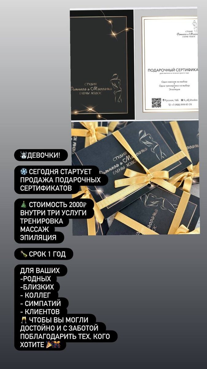 ☃️Девочки! ❄️ Сегодня стартует продажа подарочных сертификатов 🎄 стоимость 2000₽ Внутри три услуги Тренировка Массаж Эпиляция 🍾 Срок 1 год Для ваших -родных -близких - коллег - симпатий - клиентов 🥂 Чтобы вы могли достойно и с заботой поблагодарить тех, кого хотите 🎉🎊