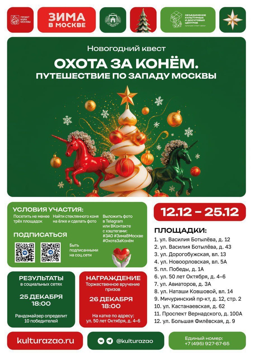 Приглашаем вас на захватывающий новогодний квест «Охота за конём. Путешествие по Западу Москвы»! Успейте принять участие, найти таинственного стеклянного коня и выиграть призы!