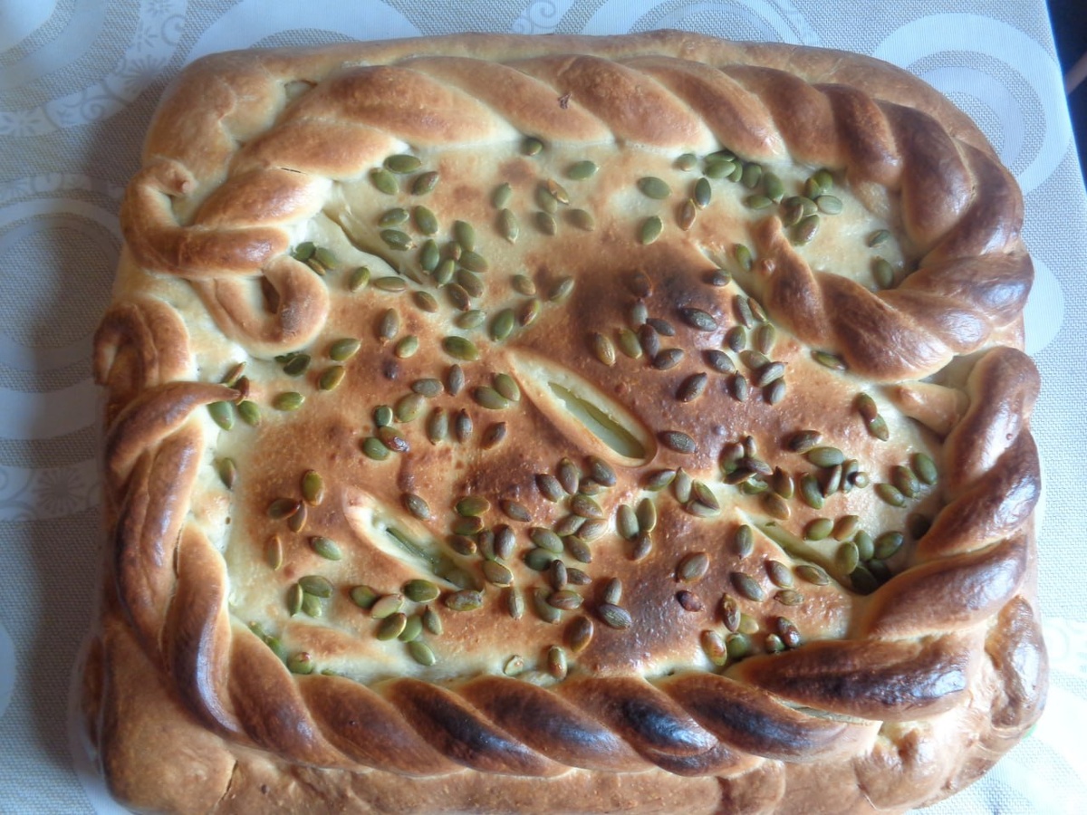 🥔 Картофельный пирог с паниром и нори 🥣 Ингредиенты Тесто: 4,5 ст. пшеничной муки • 0,5 ст. ржаной • 200 г масла • 2 ч. л. соли • 1 ст. л. сахара • 1 ч. л. соды • 0,5 ч. л. лимонной кислоты • 2 ст. кефира Начинка: 400 г панира • 1 кг картофеля (пластинки 4–5 мм) • 2 ст. л. топлёного масла • 2 горсти морской капусты или измельчённых нори • 1 ч. л. соли • укропные семена • лавр • перец • кориандр • асафетида • 2 ст. л. сливочного масла 👩🍳 Как готовить Замесить тесто из сухих компонентов, масла и кефира, дать отдохнуть 30–60 мин. Разделить на 3 части, раскатать нижний пласт, смазать маслом. Смешать картофель со специями и морской капустой. Выложить слоями: картофель → кусочки масла → панир. Накрыть вторым пластом, защипнуть швы, сверху выложить декоративный «шнур» из теста. Смазать сметаной, сделать надрезы, присыпать семечками. Выпекать 50–60 мин при 230° с миской воды на дне духовки. ✨ Секрет: декоративный «шнур» делают из двух жгутов теста. Не забудь реакцию 💛 #выпе