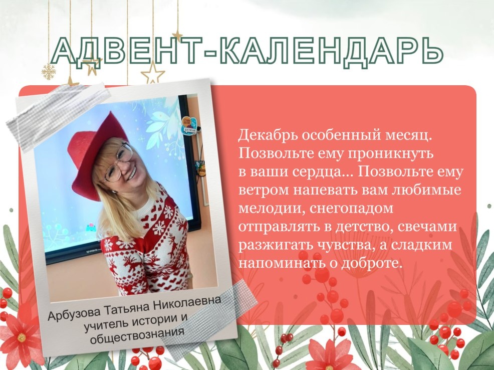 Открываем второй день нашего адвент-календаря🎄 Сегодня делимся с вами поздравлением от учителя истории и обществознания Арбузовой Татьяны Николаевны. А увидеть весь календарь можно по ссылке: vk.com/album-206909974_3078... #ДОНМ #ШколыКолледжиМосквы