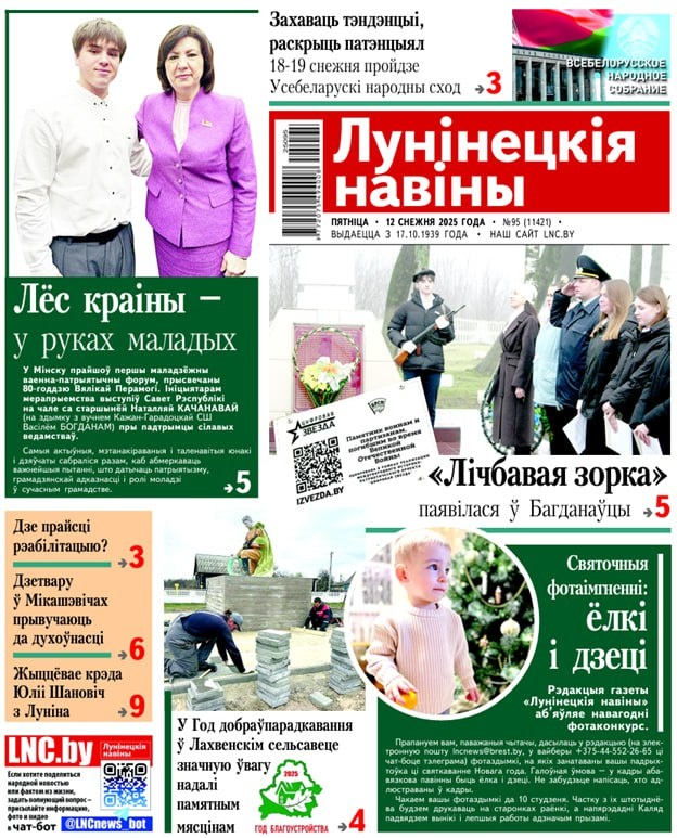 Номер газеты “Лунінецкія навіны” за 12 декабря! Одни из основных тем: — Программа социально-экономического развития на 2026-2030 годы. Своим видением поделилась делегат VII Всебелорусского народного собрания, помощник руководителя организации в управлении РУПП «Гранит» Марина ИНГИНЕН — Навагоднія акцыі! Каб жаданне кожнага споўнілася — Продолжение темы: вопросы благоустройства в городах и на территории Лахвенского сельсовета — Микашевичские горизонты: воспитание, новые назначения и «летопись» уникальной вселенной — Как работает производство по переработке рыбы и рыбной продукции в Лунинецком районе — Земляки! Заместитель начальника Брестской пограничной группы полковник Андрей Ковалевич родом из Лунинецкого района — Что нужно знать об артериальном давлении? — Фамильный «сыщик» — Металалом: дадатковы даход, парадак на тэрыторыі ці штраф? — Такси и нарушения? Бывает! — Мошенник-рецидивист под следствием — Содействие в трудоустройстве TikTok | VK | OK | Instagram | Сайт| При