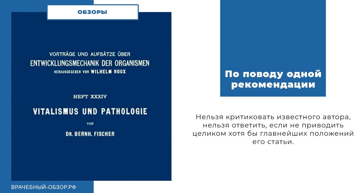В 1927 году в журнале «Новая хирургия» выходит необычная статья хирурга К. Волкова. Не про операции, не про новые швы, а про… книжку по философии и биологии. Коллега-хирург В. Р. Хесин советует всем читать книгу Б. Фишера «Витализм и патология». Говорит: она помогает выбросить из головы витализм и смотреть на организм «по-научному», материалистически. Волков честно выполняет рекомендацию: книгу читает — но видит почти обратное. 1. Что такое витализм и почему Волков злится Витализм — это идея, что в живом есть особая «жизненная сила», которая не сводится к химии и физике. Материалист скажет: всё объясняется материей, её свойствами и взаимодействиями. Хесин уверяет: Фишер — против витализма и за «единство жизненных явлений». Но при чтении оказывается: * на одной странице Фишер пишет, что сознание связано с нервной системой — звучит как нормальная физиология; * на другой — говорит о каком-то «духовном начале», которое якобы заложено во всём живом; * затем объявляет, что самосохранение и