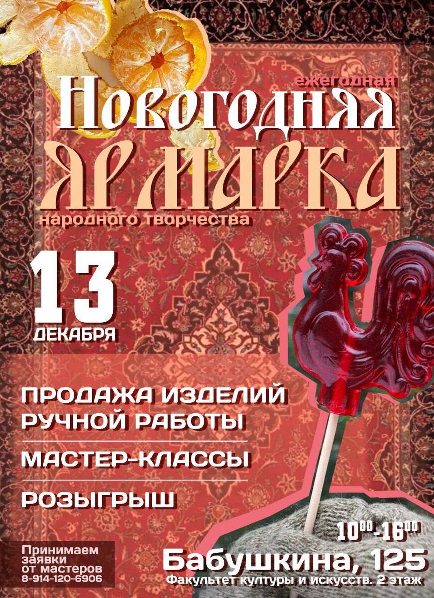 Завтра состоится Новогодняя ярмарка народного творчества На выставке авторы представят изделия в техниках вязания и гальванопластики, камнерезное искусство, украшения из ювелирной смолы и многие другие подарки ручной работы. 🕐13 декабря, 10:00–16:00 📍ЗабГУ, факультет культуры и искусств, ул. Бабушкина, 125, 2 этаж #Новости Предложить публикацию:@zabkulisye_bot