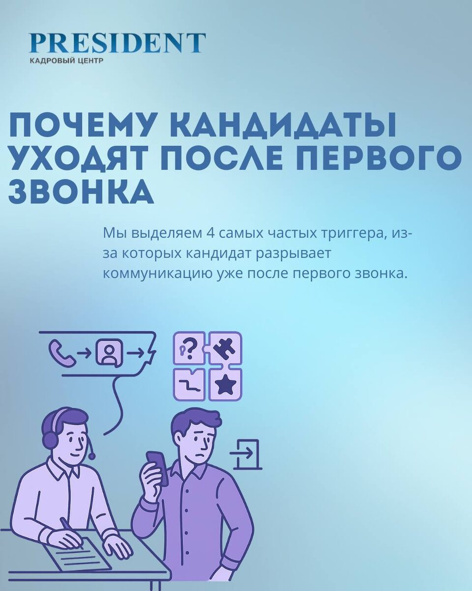 HR-инсайт: Почему кандидаты уходят после первого звонка Кандидат может отказаться от вакансии ещё до собеседования, сразу после первого контакта. Причины чаще всего очень простые, но критичные для впечатления. Делимся самыми частыми триггерами в карточках #hrинсайт #подборперсонала #первыйзвонок #воронканайма #кадровыйцентрПрезидент