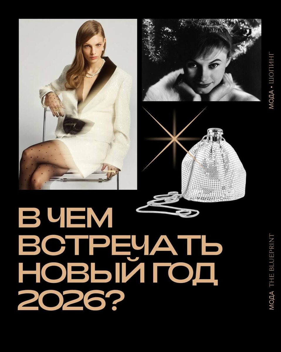 Праздничный лук на Новый год Под бой курантов советуем блистать — в меховой горжетке, леггинсах и даже фартуке — чтобы быть своим и на кухне, и за праздничным столом. 📌 Образы в духе старого Голливуда, восточных сказок и спорта — ищите в новогоднем шопинг-листе. 🔹The Blueprint