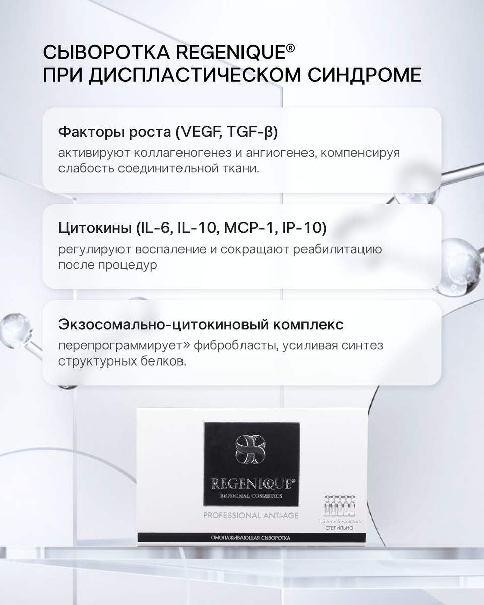 Во врачебной практике это состояние всё чаще объединяют под понятием диспластический синдром соединительной ткани кожи. Пациенты с таким типом кожи — одни из самых сложных: стандартные протоколы дают слабый или кратковременный эффект; агрессивные методики ухудшают качество тканей; филлеры и аппаратные процедуры могут усиливать истончение и фиброз. Почему так происходит? Потому что проблема лежит не на уровне эпидермиса и не в дефиците «увлажнения», а значительно глубже — в нарушении клеточной коммуникации и слабости внеклеточного матрикса. В чём суть диспластического синдрома кожи Соединительная ткань — это каркас кожи.