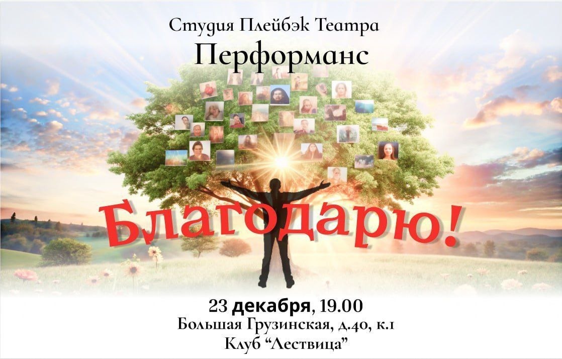 23.12.2025 вторник. #Москва Студия плейбэк-театра "Лествица" в перформансе "Благодарю" Начало в 19:00 В конце года, когда в воздухе витает магия праздника, а в соцсетях выстраиваются парады идеальных итогов, мы часто остаемся наедине с простым и сложным вопросом: 🔥А за что я могу сказать «спасибо» уходящему году? Себе? Другим? Жизни? Этот спектакль — не про громкие победы и посты в соцсетях. Он про тихую, настоящую благодарность. Мы будем исследовать самые разные грани благодарности, а может и не-благодарности. Вместе мы сможем создать живую и многогранную картину нашего общего человеческого опыта!💫 Адрес: Москва, Большая Грузинская улица, д. 40, к.1 Клуб "Лествица" Билеты: Бесплатно Обязательная регистрация по ссылке #СтудияЛествица #Перформанс #Россия