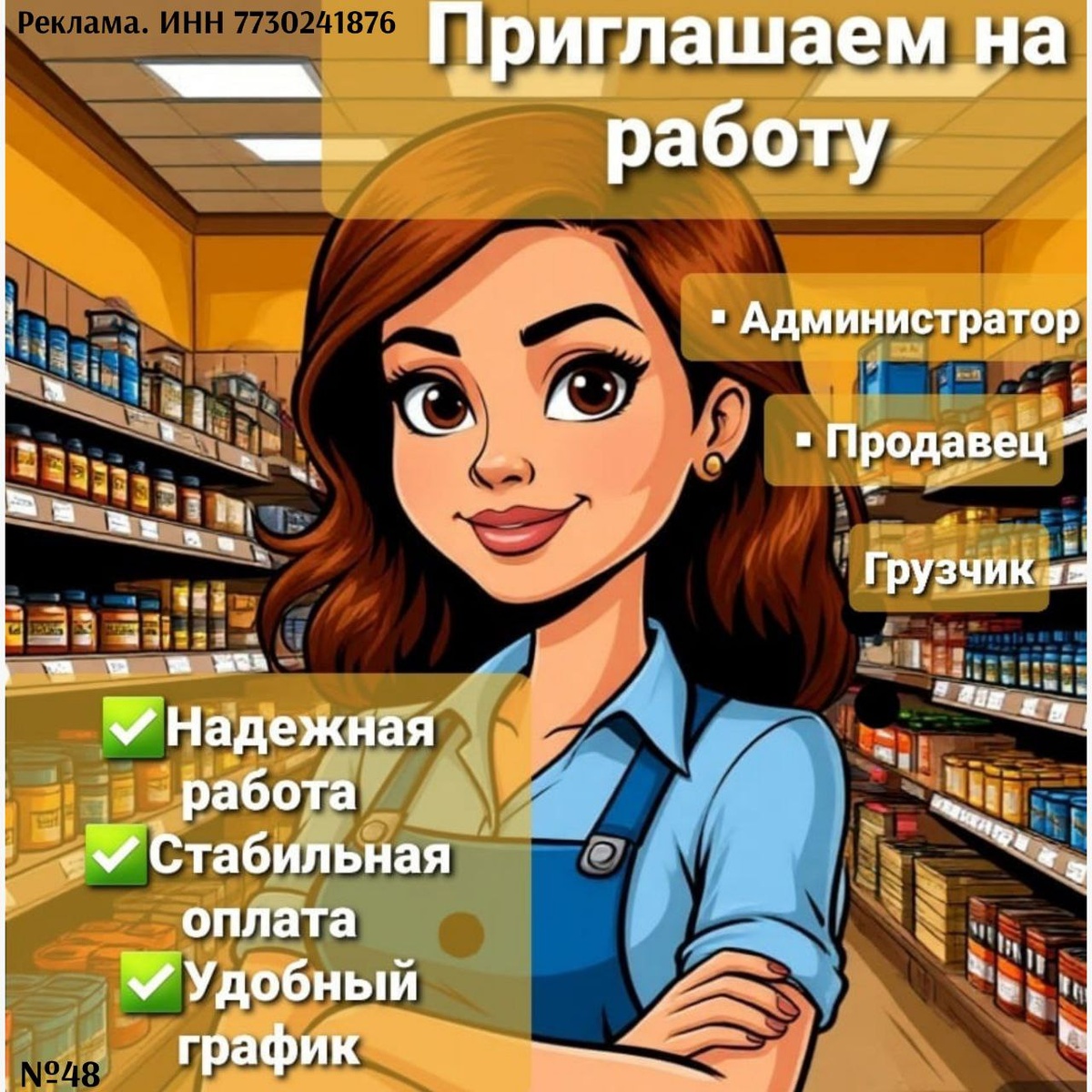 В магазин с. Грачёвка требуются: ♦️АДМИНИСТРАТОР♦️ - Стaбильнaя зapaботная плaта от 46200 - 49000руб. + eжемeсячныe прeмии (aвaнc и зп). - Смeнный грaфик рaботы 2/2 - Офoрмлениe соглаcно ТK PФ; Обязанности: - Организация, контроль и управление персоналом магазина; - Контроль товарных остатков, заказ товара; - Открытие/закрытие магазина; ♦️ПРОДАВЦЫ-КАССИРЫ♦️ - Своевременная заработная плата (2 раза в месяц) от 37300 - 40300руб. + премии; - График работы 2/2. Обязанности: - работа с кассой (наличный/безналичный расчет покупателей) - выкладка товара ♦️ГРУЗЧИКИ-МЕРЧЕНДАЙЗЕРЫ♦️ - Своевременная заработная плата (2 раза в месяц) от 38100 - 41100руб. + премии; - График работы 5/2. Обязанности: - выкладка товара по планограмме - контроль ценников и учет товара на складе - разгрузка товара ____________ - Рассматриваем кандидатов как с опытом работы, так и без. Обучаем каждого сотрудника. ☎️Звоните с 09:00-18:00 (пн-пт) по телефону 8-950-845-26-54.