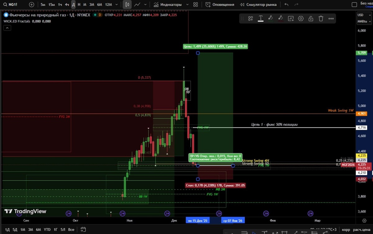 #NG 🟢Сделка LONG риск 1% от депозита. 🎯Вход: 4,210 пт или с текущих ❌Стоп: 4,038 пт 💰Тейк профит: 5,7 пт. Соотношение риска к прибыли - до первой частичной фиксации 1 к 3, до тейк профита 1 к 8,5 - Стоп закрывается при достижении, либо после закрытия недельной свечи за точкой входа. 🔔Апдейты по сделкам в чате (https://t.me/signalTradeChatzone) 📌Посмотреть статистику моей публичной торговли можно по ссылке: https://docs.google.com/spreadsheets/d/1NtCGHbEH8bAoy_93Cex3V60iqw7tfRfS5D0LRGDpqkw/edit?gid=922016881#gid=922016881 Ссылка на прогноз: https://www.tradingview.com/x/Hkcdqd23/