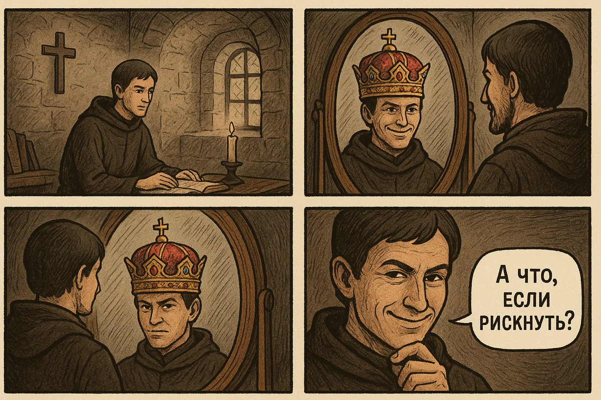 Гришка Отрепьев: "Я — царевич Дмитрий!" В России появился первый самозванец — человек, выдающий себя за царя. По официальной версии, это был беглый монах Григорий Отрепьев. Легенда: "Я — чудом спасшийся царевич Дмитрий (сын Ивана Грозного)!" 👻👑 План: Он сбежал в Польшу, где нашел поддержку у местной знати (Мнишеков) и даже у короля Сигизмунда III. Цена помощи: Отрепьев пообещал полякам русские земли (Смоленск), а Папе Римскому — ввести в России католичество. (Конечно, он врал всем). Поход на Москву: "Комар поразил льва" В 1604 году Лжедмитрий с небольшим войском перешел границу. И случилось чудо! Народная любовь: Города сдавались без боя. Люди верили, что идет "добрый природный царь", который спасет их от голода и "злого" Годунова. 😍🍞 Смерть Годунова: В разгар войны (апрель 1605 г.) Борис Годунов внезапно умер. Его юный сын Фёдор не смог удержать власть и был убит. Победа: В июне 1605 года Лжедмитрий I триумфально въехал в Москву. Самозванец стал царём! Лжедмитрий на троне: "Добр