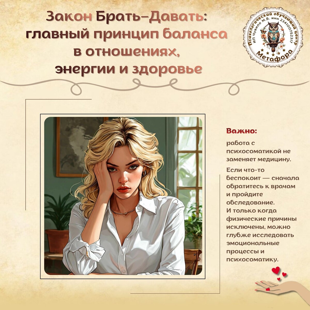 Закон Брать–Давать: главный принцип баланса в отношениях, энергии и здоровье В мироздании всё стремится к равновесию. Природа дышит циклами: прилив — отлив, день — ночь, вдох — выдох. Точно так же устроены и человеческие отношения, и наша внутренняя психика — они живут по закону баланса брать–давать. Это один из фундаментальных законов Вселенной, который работает независимо от того, верим мы в него или нет. Когда баланс соблюдён — мы чувствуем ясность, внутреннюю силу, спокойствие. Когда он нарушен — появляются напряжение, обиды, чувство вины, истощение… а со временем — и телесные симптомы. Что такое закон Брать–Давать? Суть проста: Если ты что-то отдаёшь — важно что-то получать. Если ты что-то получаешь — важно что-то отдавать. Это не про «торг» и не про материальные ценности. Баланс проявляется в энергии, эмоциях🎆, внимании, уважении, заботе, времени, любви💋, деньгах💰. Мир существует как система обменов. Когда обмен здоровый — энергия течёт свободно. Когда перекос — энергия бло