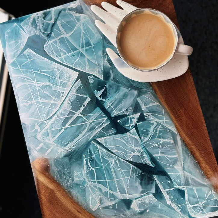 Зима - это время "холодных", кристально-прозрачных фактур. Мастера часто пытаются повторить природную красоту льда, инея и снегопада в своих работах. Но чтобы смола не выглядела как мутный пластик, а напоминала настоящий лед, нужно знать несколько технических секретов. В этой статье мы разберем 3 профессиональные техники имитации зимы, которые помогут вам создать завораживающие изделия. Посмотрите на этот столик: он выглядит так, словно скован льдом Байкала. Глубокие трещины, переходы от прозрачного к темно-синему создают невероятный объем. Как добиться такого эффекта: