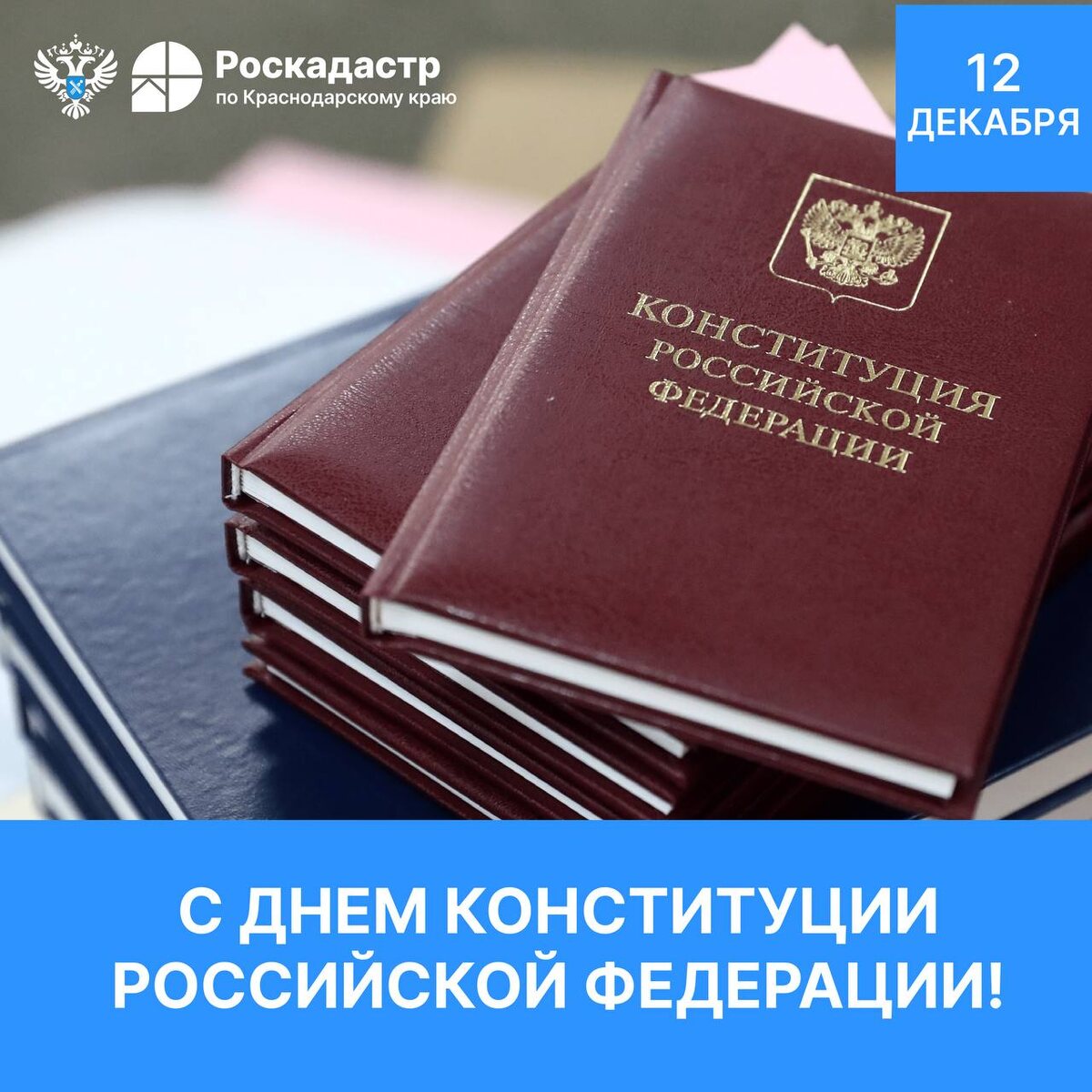 📅 12 декабря традиционно отмечается День конституции Российской Федерации! 🔹 Праздник символизирует единство нашего народа, приверженность демократическим ценностям и стремление к справедливости и правовому государству. 🔹Конституция была принята по результатам референдума, прошедшего 12 декабря 1993 года. Она существенно изменила структуру высших органов власти, что позволило усовершенствовать федеративное устройства страны. 🔹 Конституция является основным законом нашей страны, определяющим права и обязанности каждого гражданина, основы общественного устройства и принципы власти. Она служит фундаментом стабильности и развития российского государства. 🎉 Филиал ППК «Роскадастр» по Краснодарскому краю поздравляет с памятной датой. Пусть наша страна процветает, укрепляется ее сила и величие, а каждый гражданин чувствует себя защищенным и уверенным в завтрашнем дне.