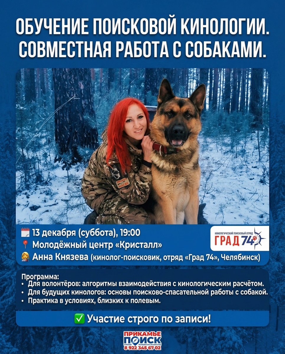 ОБУЧЕНИЕ ПОИСКОВОЙ КИНОЛОГИИ | СОВМЕСТНАЯ РАБОТА С СОБАКАМИ 📅 13 декабря (суббота) | 🕖 19:00 | 📍 Молодёжный центр «Кристалл» Ведущая: Анна Князева — опытный кинолог, руководитель Кинологического поискового отряда “Град 74” (https://vk.com/club194761589), Челябинск. 👉 ДЛЯ ДЕЙСТВУЮЩИХ ВОЛОНТЁРОВ #ПрикамьеПОИСК: Повышаем эффективность поисков! Учимся: ✓ Правильно распределять задачи при работе с кинологическим расчётом. ✓ Корректно вести себя во время работы собаки. 👉 ДЛЯ ТЕХ, КТО ХОЧЕТ СТАТЬ КИНОЛОГОМ: Узнайте, как начать путь в поисковой кинологии: ✓ Поймёте основы поисково-спасательной работы с собакой. ✓ Попробуете себя в роли волонтёра-кинолога. Формат занятия: 🔹 Теория — алгоритмы взаимодействия, основы кинологической работы. 🔹 Практика — отработка навыков в условиях, приближённых к полевым. ✅ Участие только по записи! Записаться → в личные сообщения Ольге Перминовой (https://vk.com/id58101681)