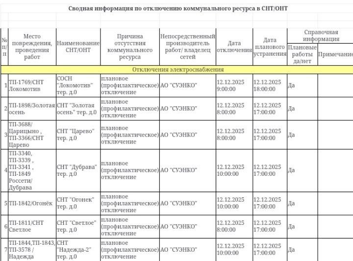 Информация по плановым отключениям в СНТ/ДНТ на 12.12.2025 от ЕДДС города Тюмени