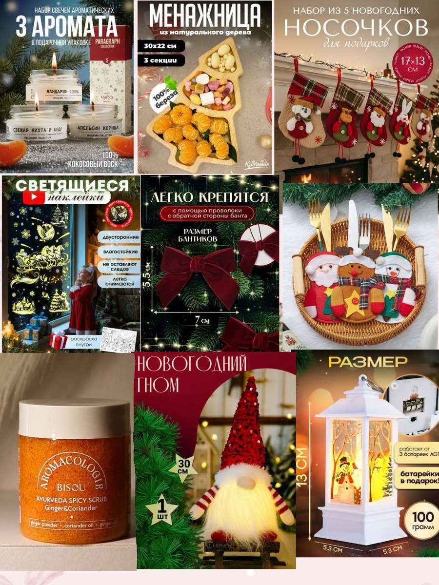 🎄Уже скоро Новый 2026 год🎄 Делюсь с вами некоторыми товарами, которые могут Вам пригодиться в преддверии праздника! 1.Аромосвечи 172465459 2. Менажница 279250554 3.Новогодние носочки для подарков 533266040 4.Светящиеся наклейки на окна 488712348 5.Бантики на ёлку 577128844 6.Конвертики для сервировки стола 261964281 7.Имбирный скраб для тела 166405310 8.Новогодний гном 97065902 9. новогодний фонарик 104321728