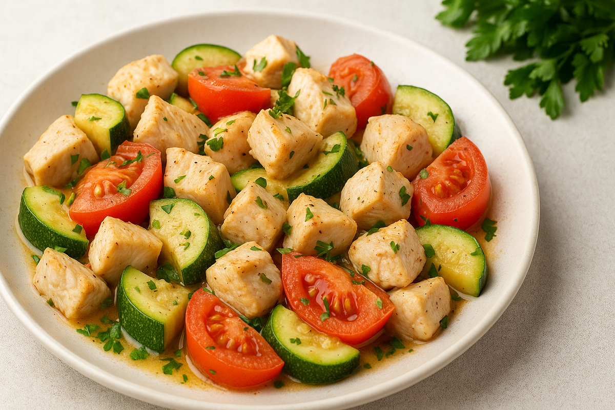 При диабете реакция на продукты индивидуальна — проверяйте сахар после новых блюд. 🥗 Ингредиенты (2 порции) Куриное филе — 250–300 г Кабачок или брокколи — 250 г Помидор — 1 шт. (по желанию) Чеснок — 1 зубчик Оливковое масло — 1 ч. л. Соль и перец — по вкусу Зелень — по желанию 💡 Можно использовать замороженные овощи — они готовятся так же быстро. 👨🍳 Как приготовить 1. Подготовьте продукты Курицу нарежьте небольшими кусочками.
