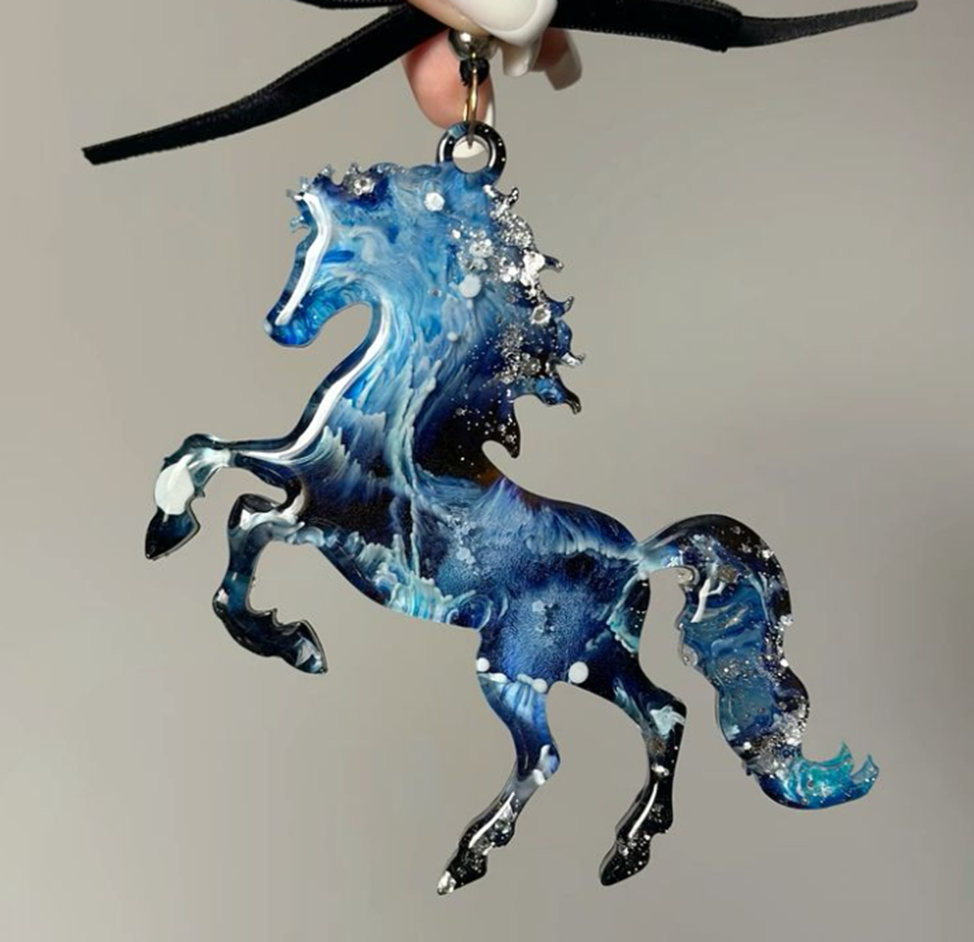 2026 год пройдет под знаком Красной Огненной Лошади. Это сильный и энергичный символ, который открывает огромный простор для творчества. Работая с эпоксидной смолой, мастера не ограничены одним цветом или фактурой. Используя одну и ту же силиконовую форму, можно получить изделия, которые будут кардинально отличаться по настроению и стилю. В этом обзоре мы рассмотрим реальные примеры оформления символа года. Надеемся, эти фото вдохновят вас на эксперименты с цветом и наполнителями. Сочетание глубокого синего и кипенно-белого цветов всегда смотрится выигрышно. В этом варианте лошадка напоминает бушующее море или морозные узоры на окне. Как это сделано: