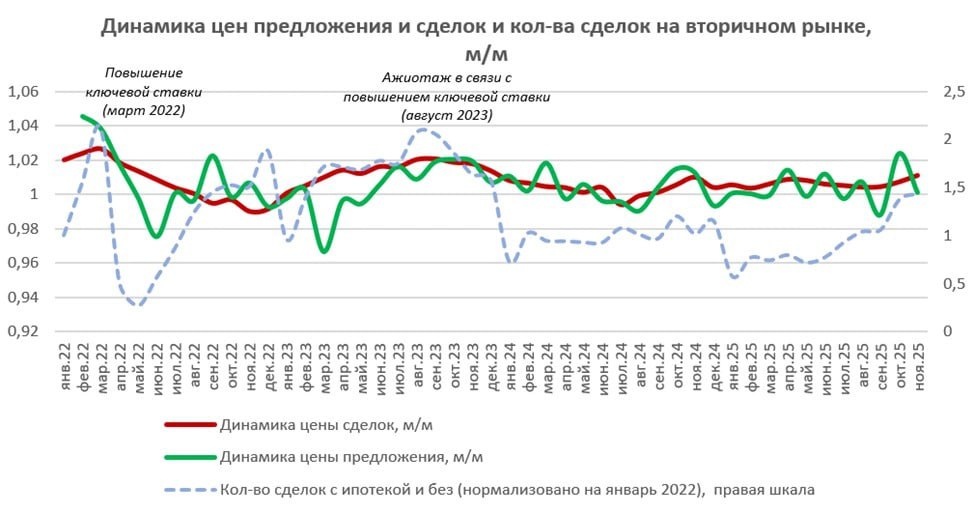 ⚡️ Вторичное жильё в России обогнало новостройки по росту цен в 2025 году, показало совместное исследование «Домклик» и «СберИндекс». За ноябрь «вторичка» подорожала на 7,5% в годовом выражении, тогда как новостройки — на 6,1%. Особенно заметно выросла стоимость «новой вторички» — жилья в домах, построенных за последние 10 лет: +9,9% за год, до 168 тыс. руб. за «квадрат». Разрыв с новостройками составил 7,1%. При этом в ноябре цены на первичном рынке продолжили рост седьмой месяц подряд, достигнув в среднем 179,9 тыс. руб. за м². 🏙 Ценовые лидеры среди новостроек: ▪️ Москва — 381,2 тыс. руб./кв. м ▪️ Санкт-Петербург — 249,1 тыс. руб./кв. м ▪️ Московская область — 201,2 тыс. руб./кв. м 📈 В ноябре цены на первичном рынке росли седьмой месяц подряд. Наиболее значительно они выросли в Московской области (+2,8%), Москве (+2,1%) и Нижегородской области (+1,7%). В годовом выражении лидирует Удмуртская Республика (+16,6%). 🏘 На вторичном рынке средняя цена кв. м составила 119,4 тыс. руб.